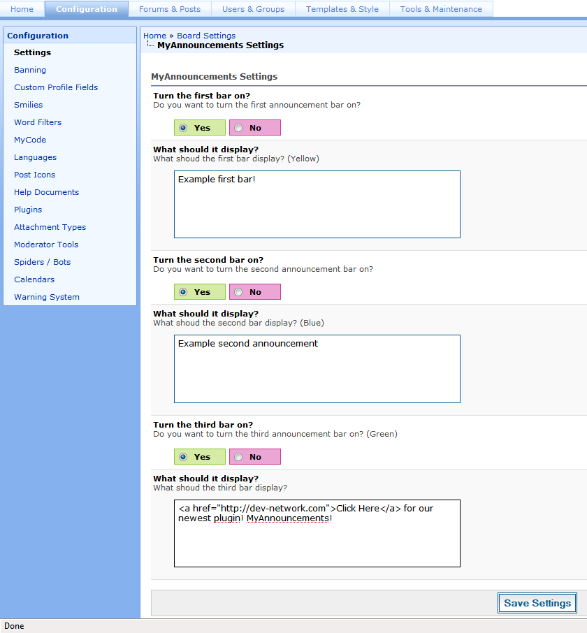 The lite verison of the MyAnnouncements Plugin. It allows you to create announcement bars at the top of the index.