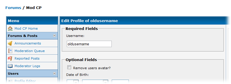 This plugin adds the ability to change peoples usernames from the moderator control panel profile editor. Simply change the username in the box and submit.Autor: Tim B.
