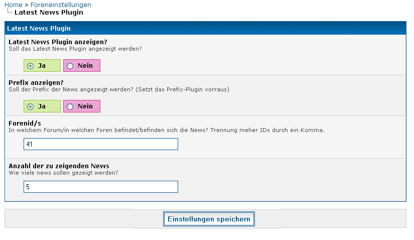 The Latest News Plugin is a Plugin which shows the last News from a forum (adjustable) on the indexpage. Also, you can select how many news schould be displayed. The plugin can also be completely hidden. If the Prefix-Manager is installed, the prefix of the news can also be displayed.