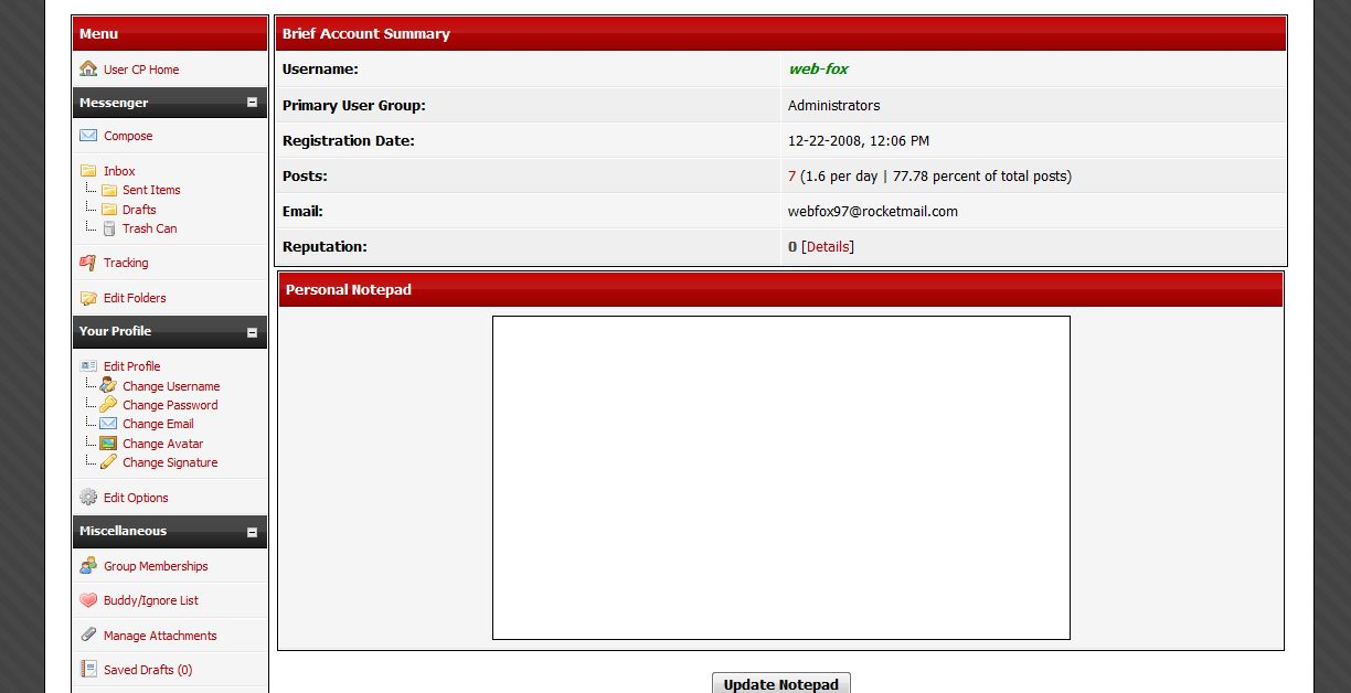 Change Log: http://fox-hosting.org.uk/forum/showthre...d=10#pid10[img]http://mods.mybb.com/uploads/previews/16525-1230345047-ucp.thumb.JPG[/img]