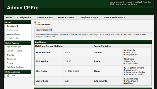 Admin CP.Pro Green is a theme for the MyBB 1.4 Admin CP. It is clean and professional, yet simple and easy on the eyes.Autor: Zash