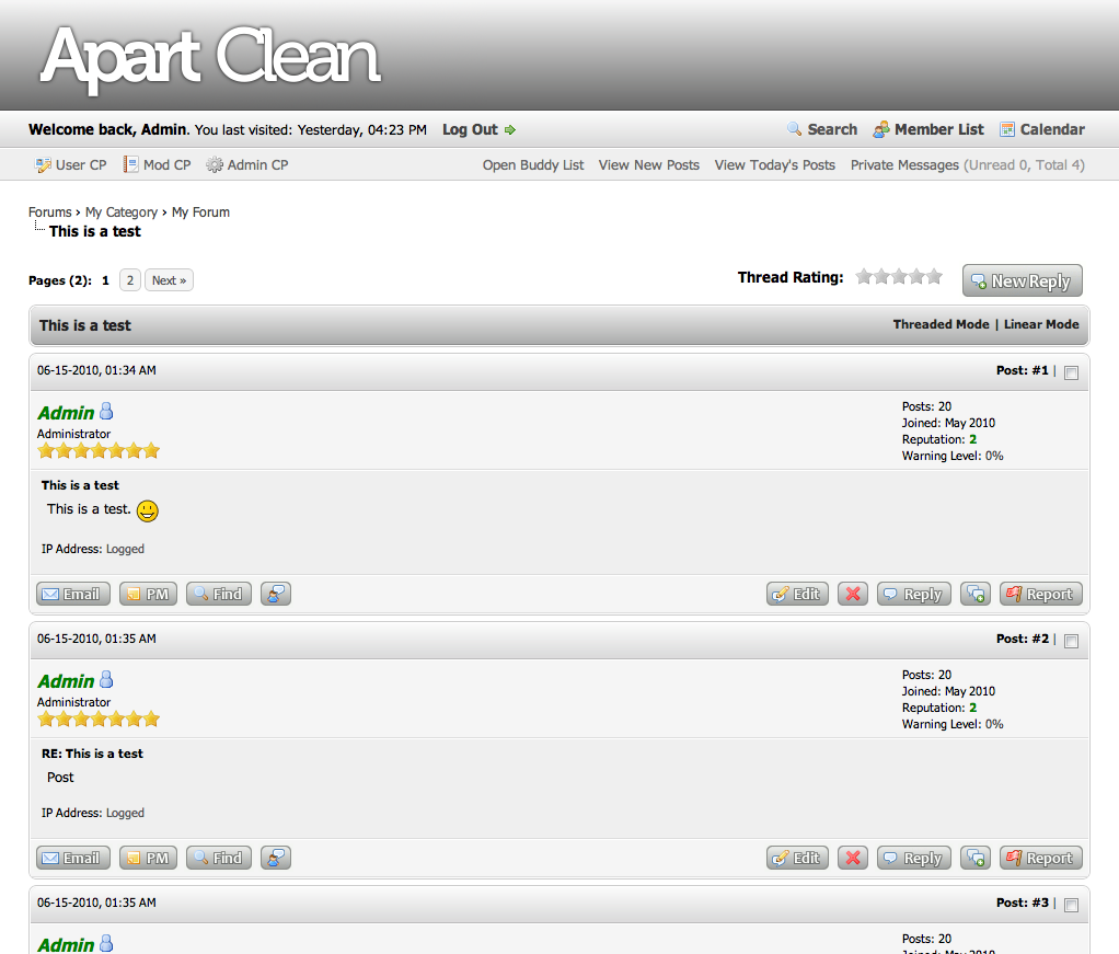 The Apart theme series for MyBB 1.6 is a set of simple yet beautiful themes in various color combinations. Apart Clean uses light gray tones to create a professional yet relaxed atmosphere.Deutsche Übersetzung: noch nicht übersetzt