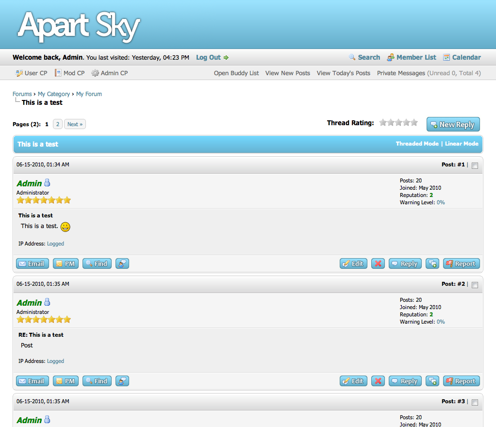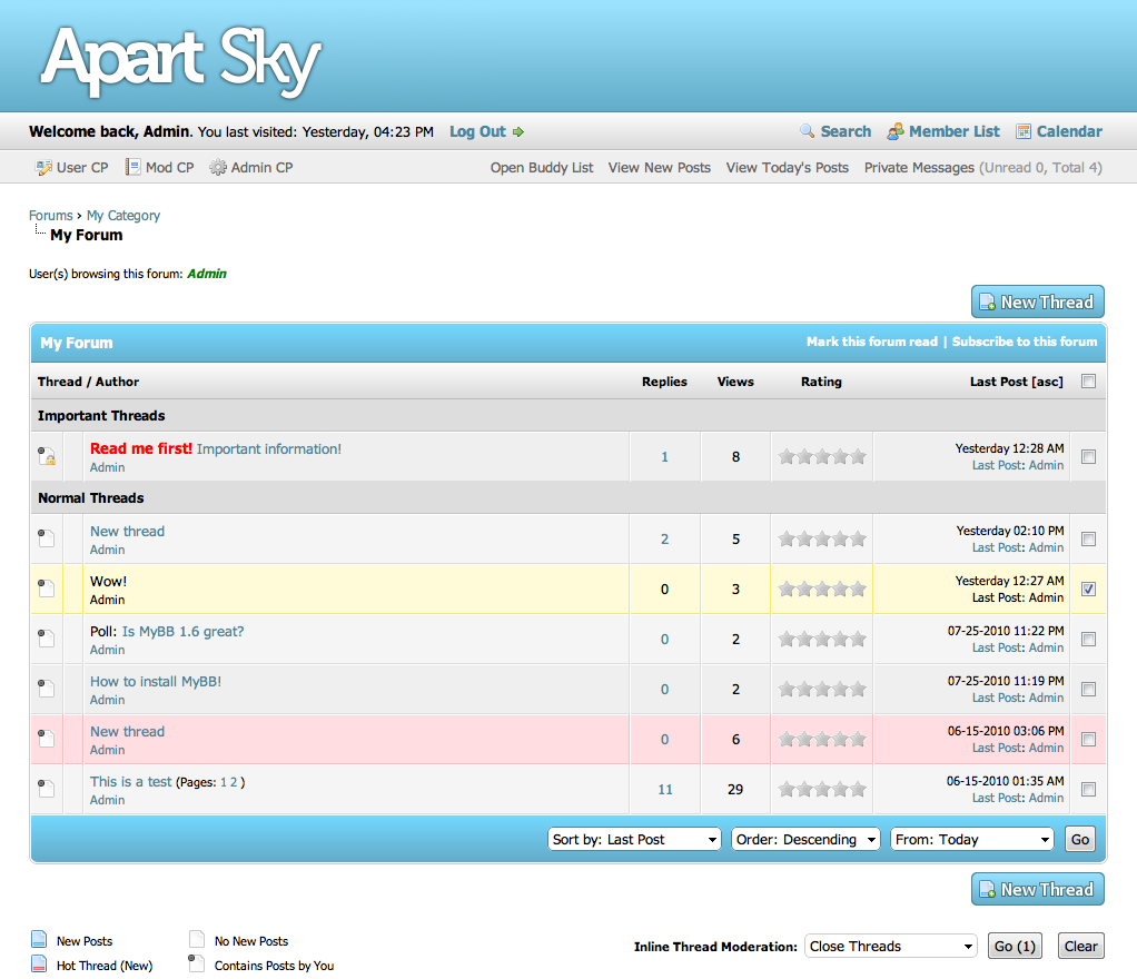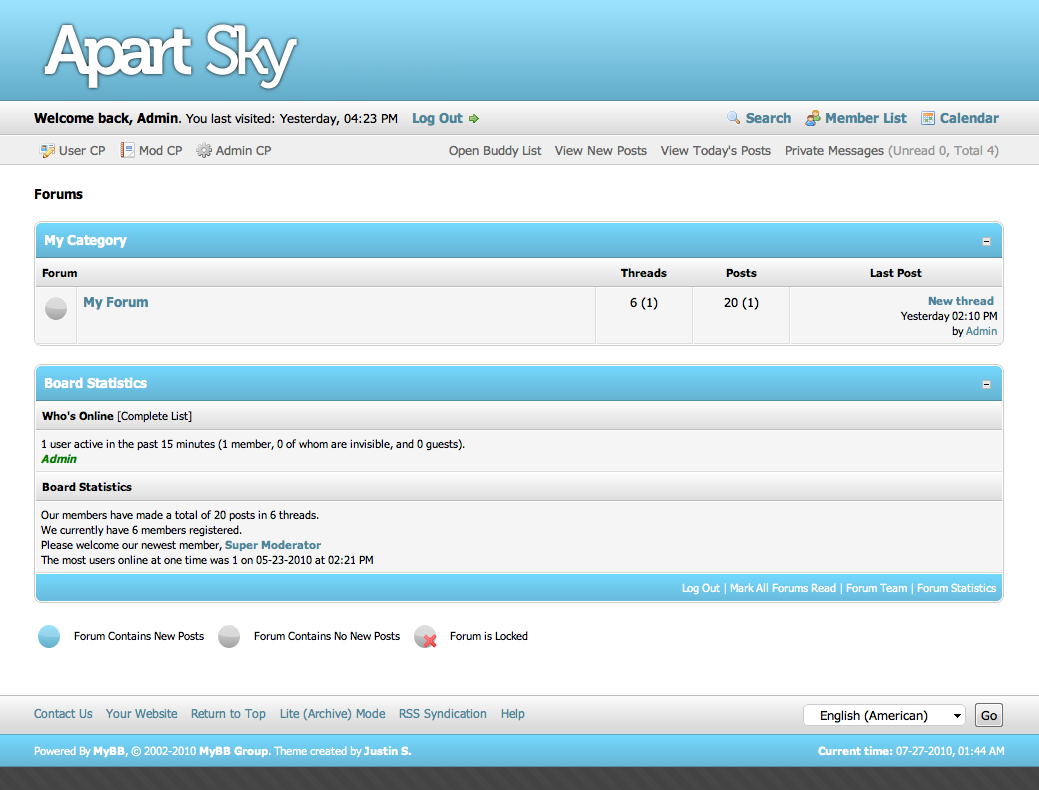 The Apart theme series for MyBB 1.6 is a set of simple yet beautiful themes in various color combinations. Apart Sky uses sky blue and white tones to create a professional yet relaxed atmosphere.Deutsche Übersetzung: noch nicht übersetzt