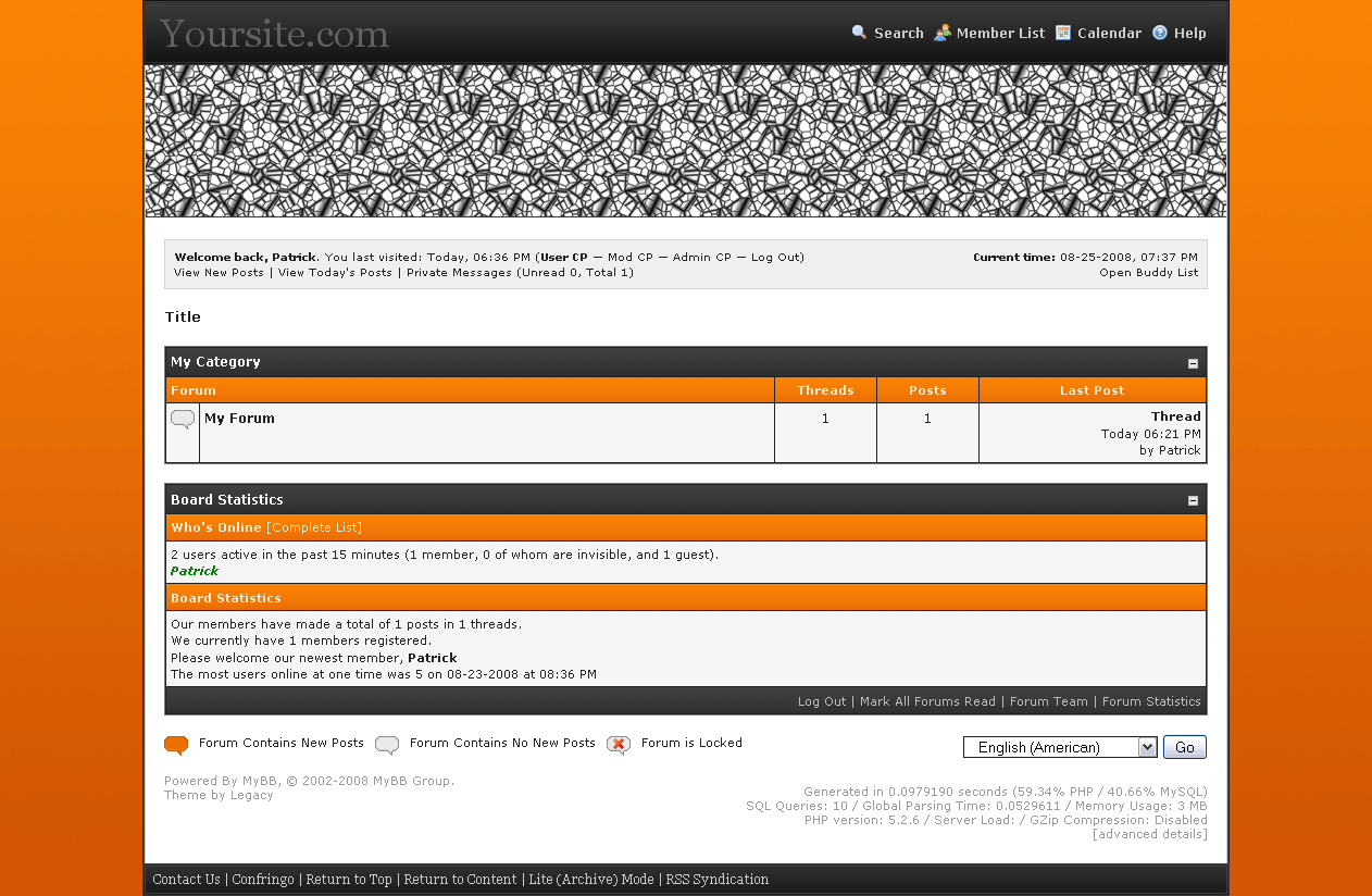 An orange, black, and white theme for MyBB 1.4xAutor: Legacy