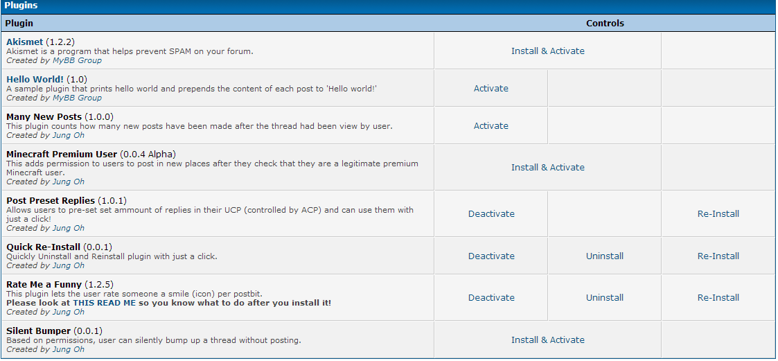 When you uninstall this plugin, you're going to have to revert the page back!Quelle: Quick Re-Install bei MyBB.com