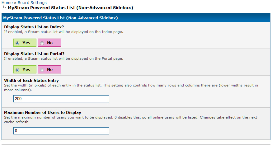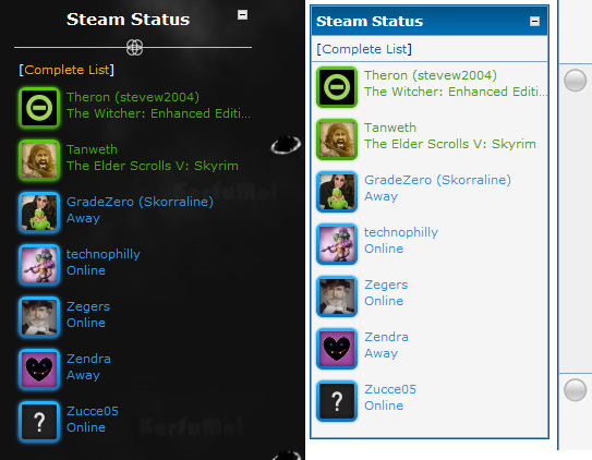 - A status list (modeled on Steam's built-in friends list) that lists all integrated forum users currently on Steam, including their avatars, their names, and their current statuses. This can either be displayed on the Index or Portal pages, or displayed in a sidebox on any page if you have Advanced Sidebox installed.