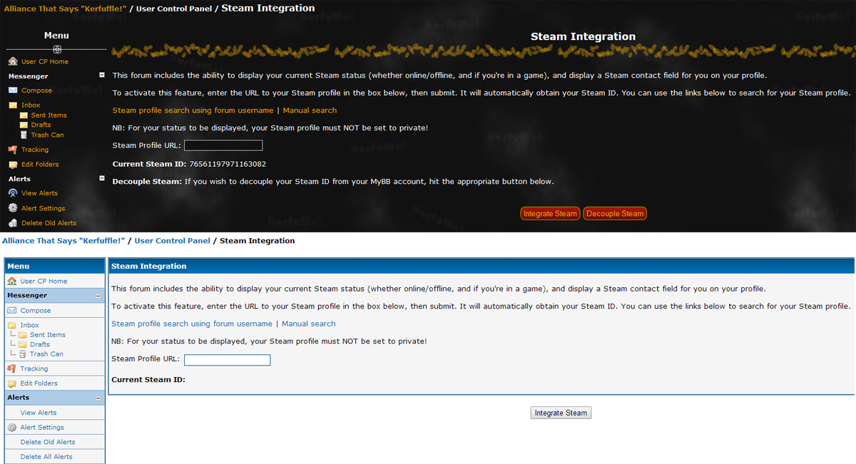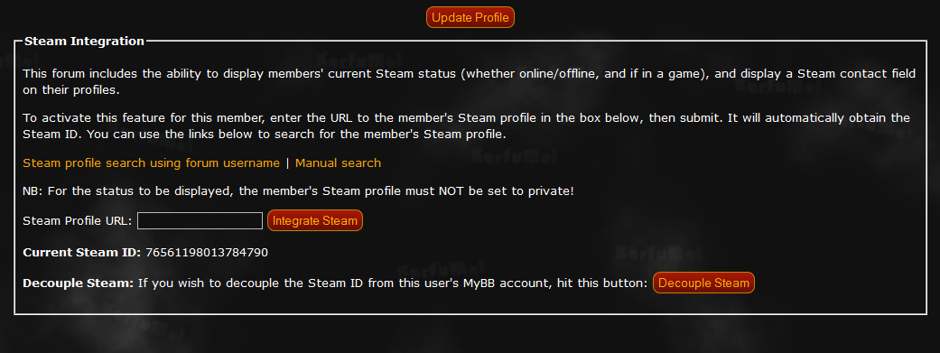 - Includes a new User CP form for users to use to integrate their Steam accounts. Also includes a new section on the Moderator CP Profile Editor to allow moderators to integrate Steam for their users.