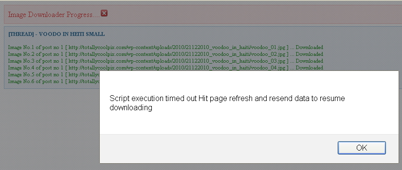 If Script execution times out then click this image after that refresh page (donot hit back button) you will be asked by browser to resend data click OK to resume downloading where you left.The limit is set to 10 minutes