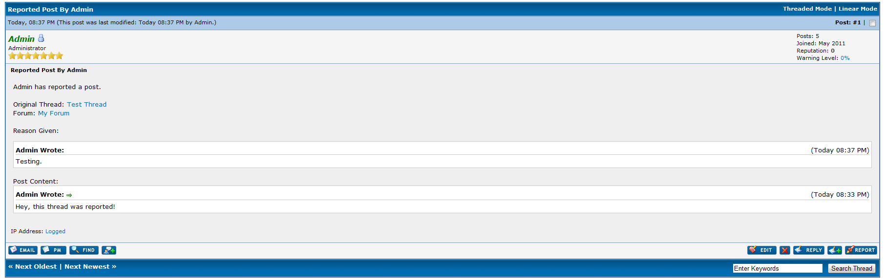 When a post is reported, if the plugin is enabled a new thread will be created under the specified forum ID (can be changed under the plugin's settings in the Admin CP) by the user who reported the post containing a bit of information about the report such as the reason, the thread's link, the forum in which the thread is located and the posts contents at time of being reported.