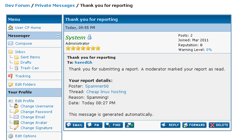 This plugin notify the reporter user through PM, when a moderator markes his/her report as read. You can use these variables in your message to personalize it:Autor: SaeedGh