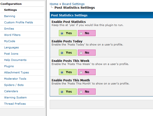 Post Statistics is a plugin that adds and counts how many posts you have made today, this week, and this month. It will reset using the MyBB Task system every time it needs (for example it will reset each week for "This Week").Autor: NaXuh