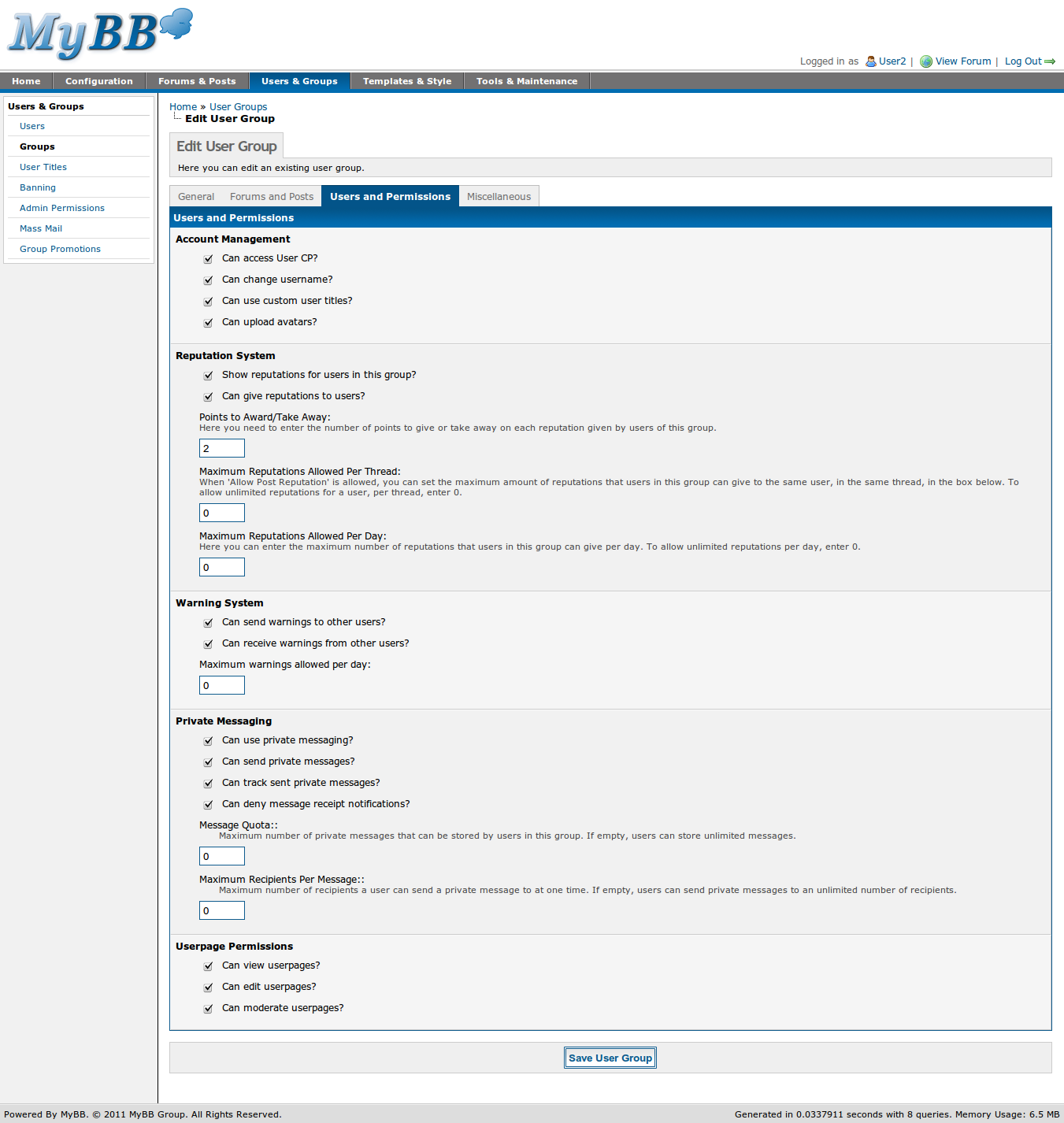 - Usergroups. Select the usergroup that you wish to change permissions for, then click on the Users and Permissions tab and scroll to the Userpage Permissions section.