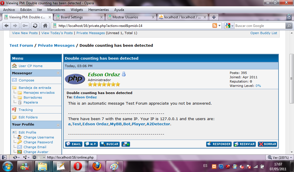 This plugin has a function that makes it easy to detect when a user logs if you were previously registered by the IP if this user was already registered with the same IP sends a private message to the desired user (the user is configured by administration panel) and the user will reach the PM with the information for banneo it or leave it in the forum.