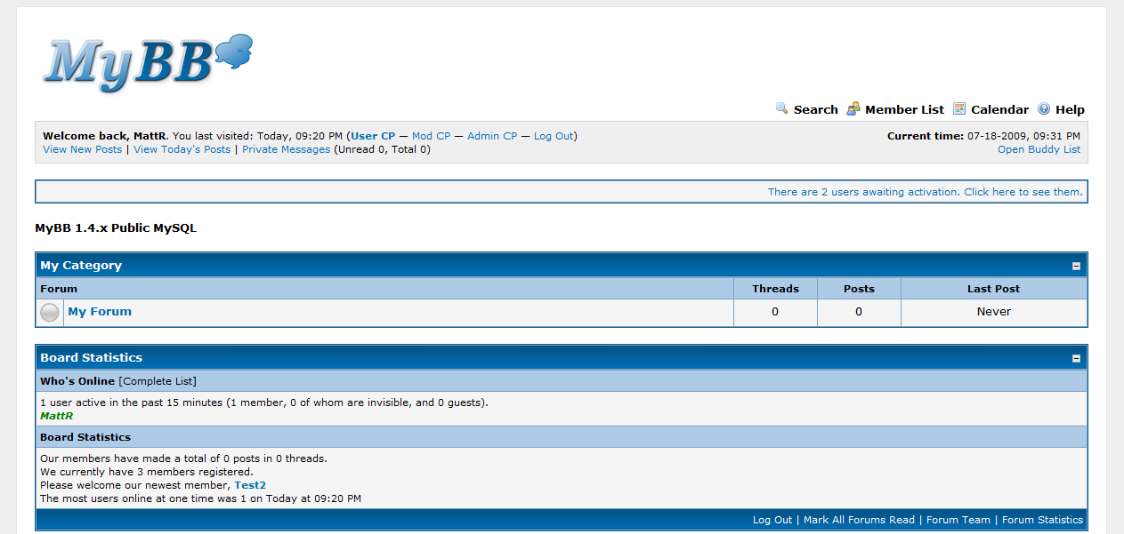 20/11/10 - v1.6.3 -> v1.6.4 -> Fixed a bug where it wouldn't recount the number when deleting a user that was awaiting activation. Also now recounts when you add and merge users. To upgrade, reupload ./inc/plugins/aacount.php.