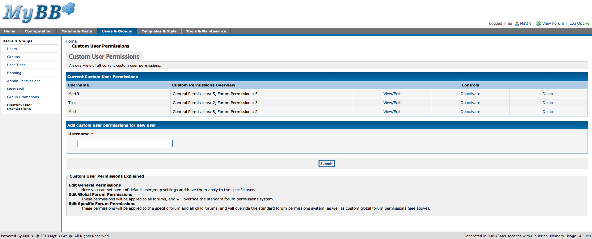 03/12/10 - v0.1 -> v0.2 -> Added the ability to set global forum permissions, instead of just permissions for specific forums. To upgrade, reupload ./inc/plugins/customuserperms.php, ./admin/modules/user/customuserperms.php, ./inc/languages/english/admin/user_customuserperms.lang.php