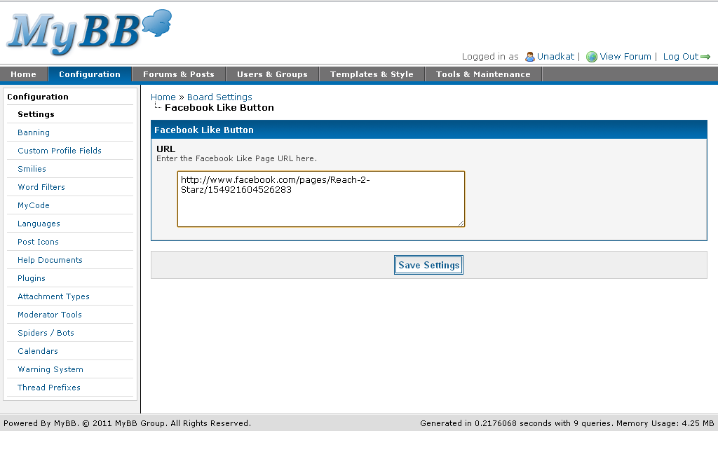 4. Next, proceed to ACP > Settings > Configuration and find Facebook Like Button settings and add the URL of your Facebook page in the texbox and click save settings.