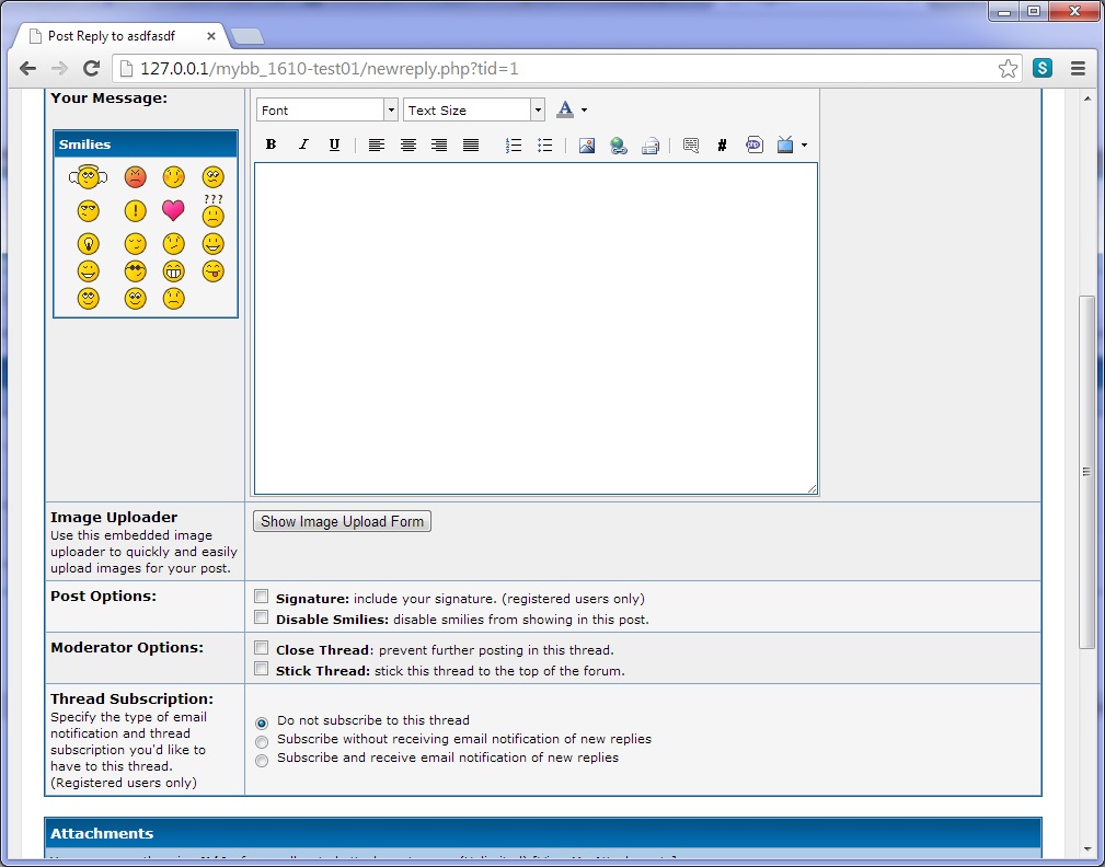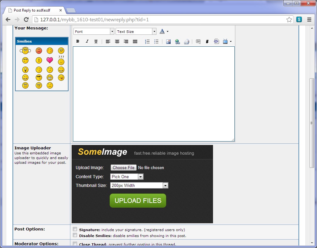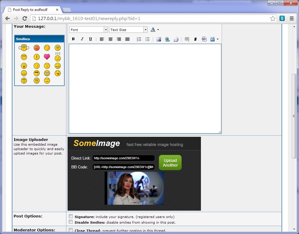This plugin embeds a small image upload form below the post editor in the new thread, new reply, edit post, and compose PM, forms. This makes it easy to quickly upload images and insert into your posts without having to worry about multiple tabs/windows or people using up your attachment space. Images are hosted from SomeImage, a premiere image hosting site.Autor: spork985
