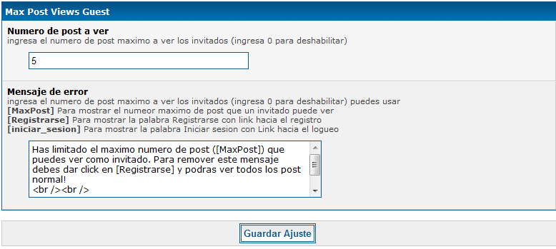 configura el numero de post y el mensaje de error a mostrar desde panel de adminstracion