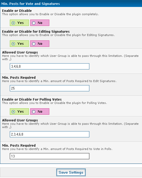 The plugin comes with all the options you might need, in order to control on the options. Two separate Enable & Disable options for both Editing Signatures and Polling Votes, Two separate User Groups options and Two separate Min. Posts options makes this plugin a more powerful.
