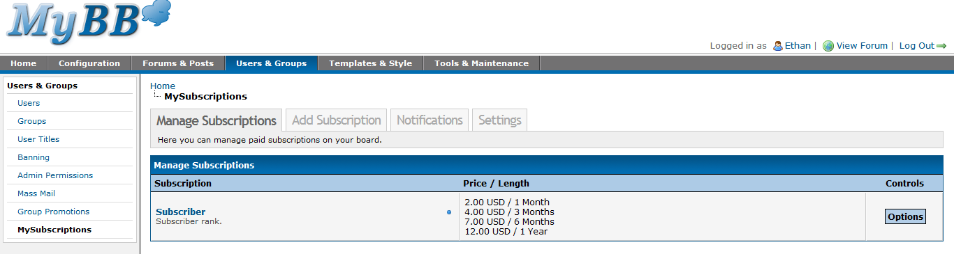 MySubscriptions is an advanced subscription plugin for Mybb. It allows the administrator to install a payments system for different groups on their forums. The plugin works similar to vBulletin's payments system included by default.Autor: EthanD