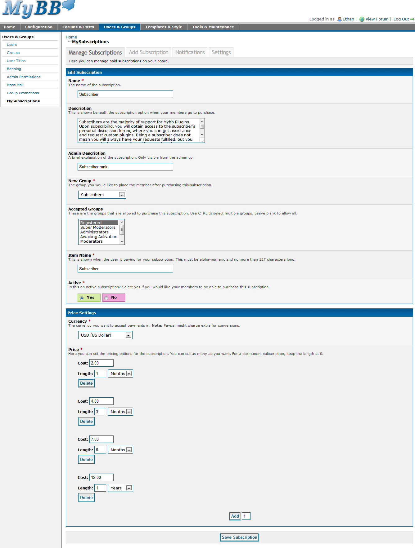 With MySubscriptions, you are able to set multiple prices/times for the same subscription. This makes it easier for the user to purchase a subscription for whatever amount of time they want, as long as the administrator added it.