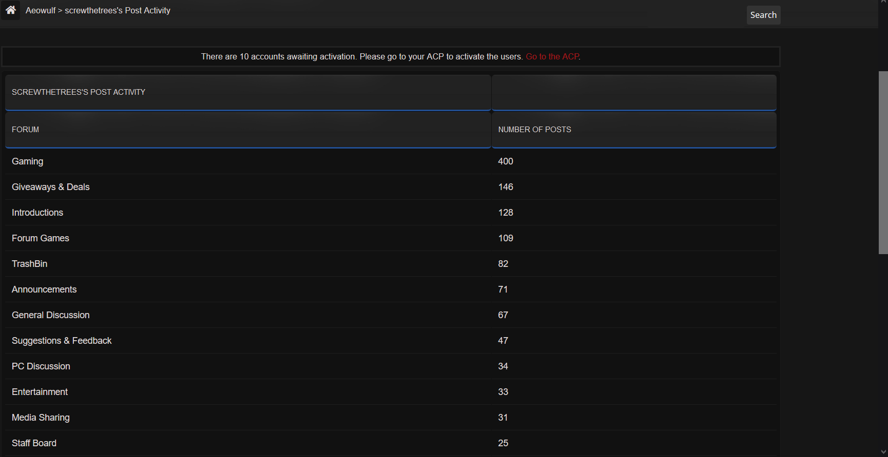 Allow users to see how many posts they or another user have posted in each forum.