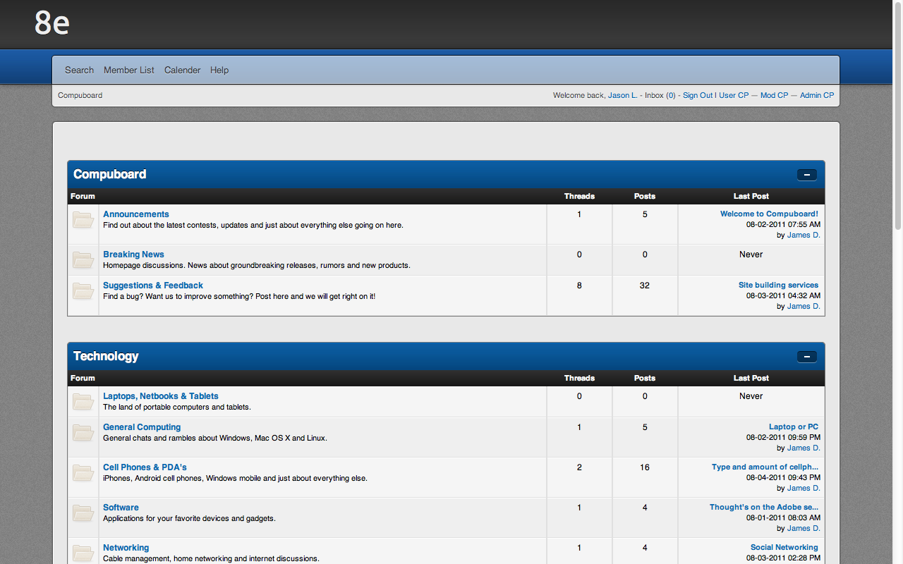 This theme contains a blue, red and green version. 8e is a super elegant awesome theme for MyBB 1.6.