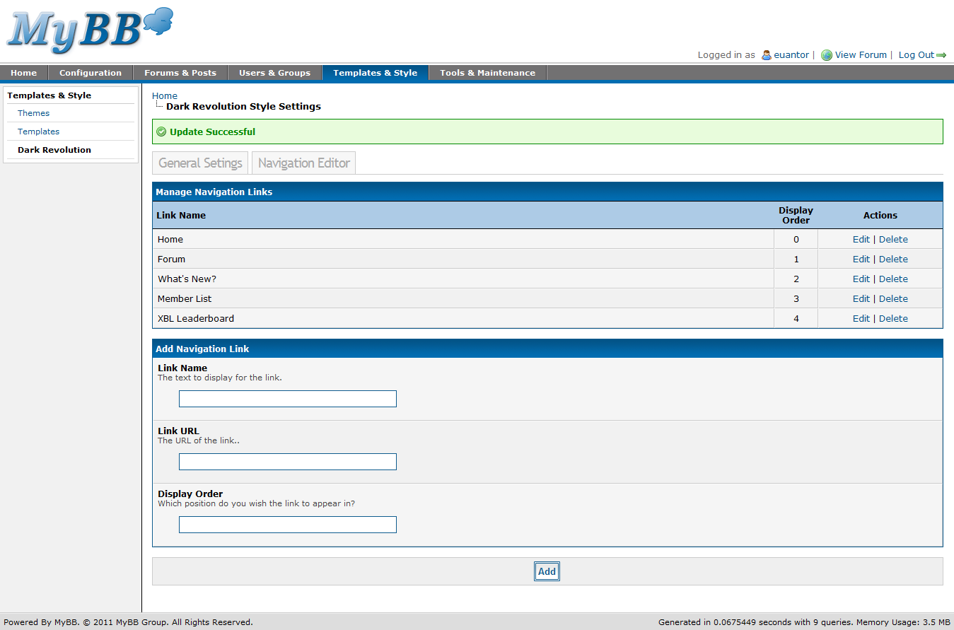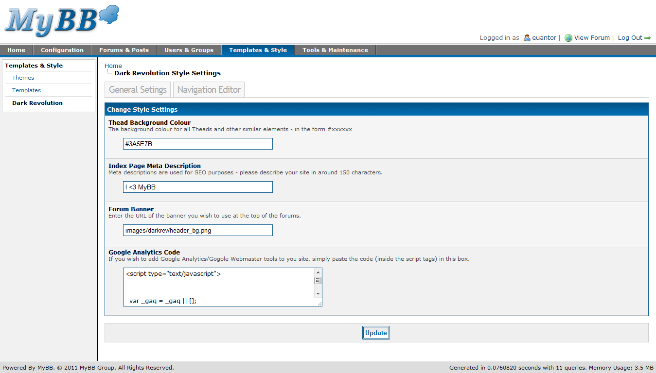 Dark Revolution is my first public theme release in quite a long time. The theme name comes from the fact that the theme itself comes with a feature I've never seen before - a theme control panel (kind of -it's still very simple). Basically, once you install the theme and the accompanying plugin, you can customise the colour of the theads and buttons using a single control panel within the Styles & Templates area (see the screenshot below). The theme also includes some fancy jQuery effects as is to be expected.Autor: Euan T
