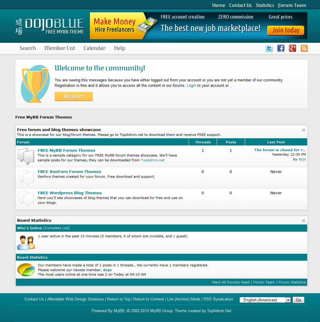 Free MyBB theme, carefully crafted with 2 menus, social media icons, advertising banner space and beautiful graphics. It's a very elegant and professional looking theme, with a custom font, custom guest welcome message and many other great details.Autor: dojo