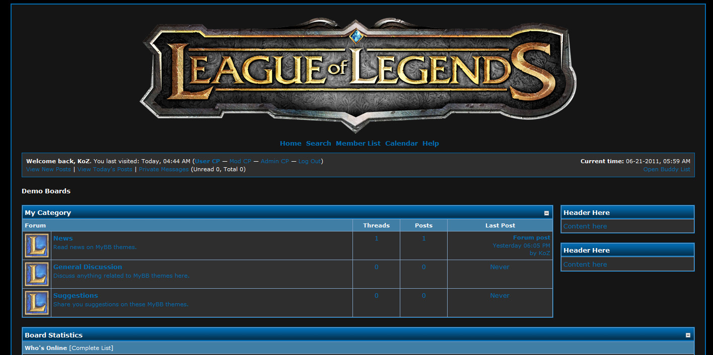 DarkLoL is a League of Legends fansite MyBB theme. It's base colors are blue and black. This theme is dark, so mostly used on underground based websites or people who enjoy dark schemes. Autor: koz