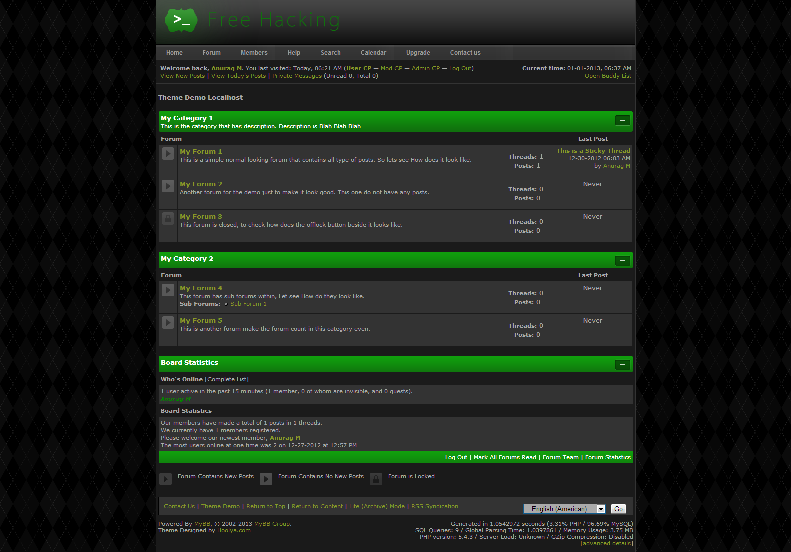A Dark Colored theme with a green base color, mostly suited for Hacking, Coding, Gaming and Tech Forums. However you can use it anywhere you can. It has a completely new Header Designs with a new CSS menu added. Also It has an improved Forumbit Design. Most of the functions of this theme are default as I tried to keep it simple. So I hope you will enjoy using this theme.Deutsche Übersetzung: noch nicht übersetzt