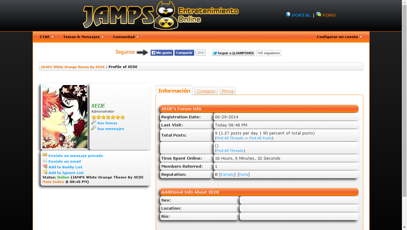 Este es mi tercer theme para MyBB, el mismo lo denomine JAMPS - White Orange, y seria la versión 2.0 del estilo ya que fue uno de los primeros que cree cuando inicie en los sistemas de foros Mybb.