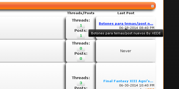 The issue in this images in my language which is Spanish, which is changed to English or the language that each person use MyBB from ACP, the theme itself is made ??of a 100% CSS, so do not need pictures, buttons and other options are made with CSS, in this case to simplify the installation file "Jamps - White Orange.zip" found 2 files * XML name SPANISH one end, and another the same but with the name. ENGLISH the end are the same files but one is translated into English for some minimal words, the rest is changed from the ACP MyBB language using this theme to be made ??100% in CSS, it is super light on your load as easy to modify it for each person.