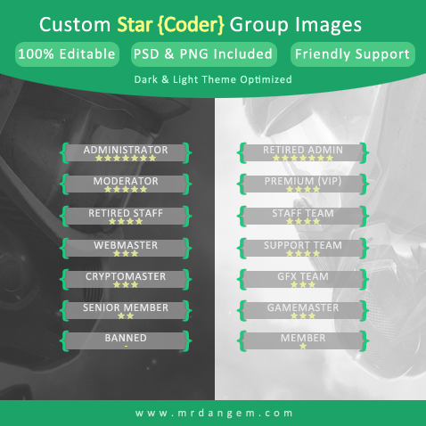 Hello Everyone! I'm proud to present to you my new simple custom rank/group image inspired by codeforum community. Custom Star Coder Group Images is made with Photoshop with a personal touch of a coder, looks great for any kind of theme and you can freely customize it for your forum. Hope you guys enjoy and make awesome stuff with it. Autor: mrdangem