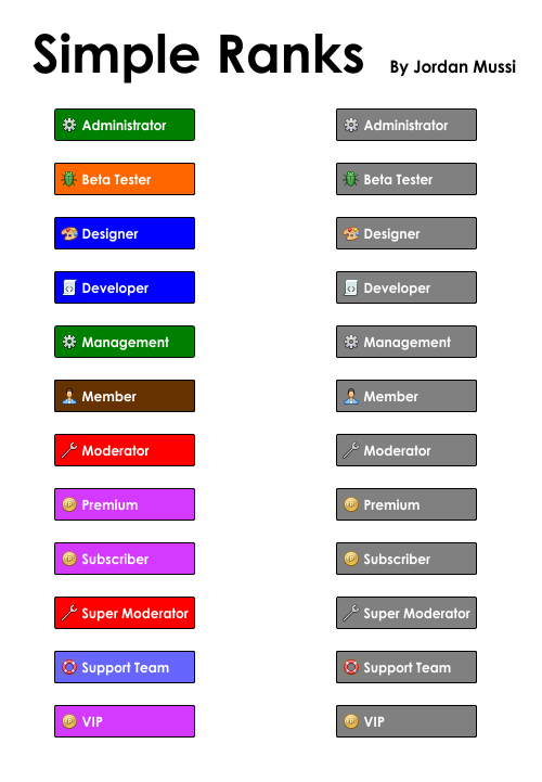 12 clean usergroup ranks/images suitable for most forums. Available both as a mixed-colour set or a uniform grey set.