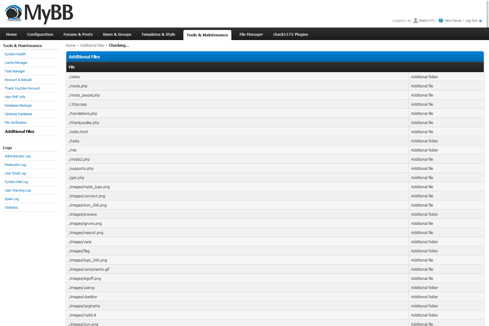 Description: Additional Files is a plugin for MyBB 1.8.* that adds a new section in the AdminCP that checks for additional files and folders in the board directory.