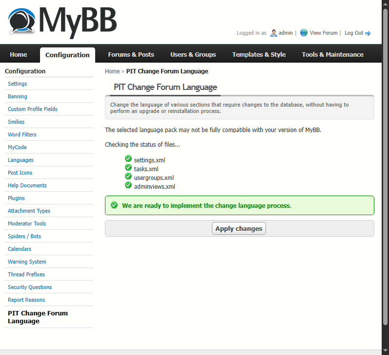 Currently, the necessary language files are named settings.xml, tasks.xml, usergroups.xml, adminviews.xml, which are available in the install directory, and a php file that contain language pack info like MyBB language pack info files. This is to speed up and facilitate the work of various MyBB communities around the world. If you have them ready, you can include them in the plugin and use them easily.