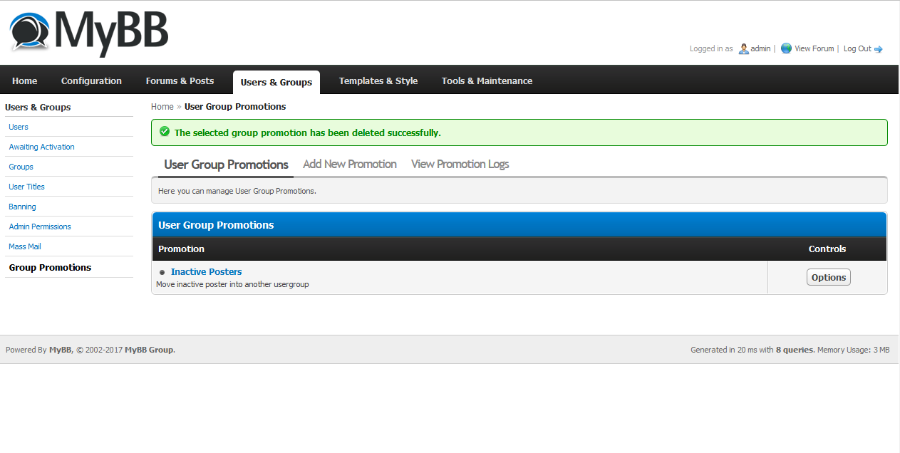 Simple MyBB 1.8 plugin to add a promotion option to push inactive forum user into another user group.