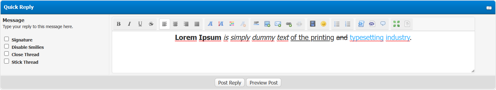 This plugin adds the MyCode Editor and the Smilie Inserter to the Quick Reply form.