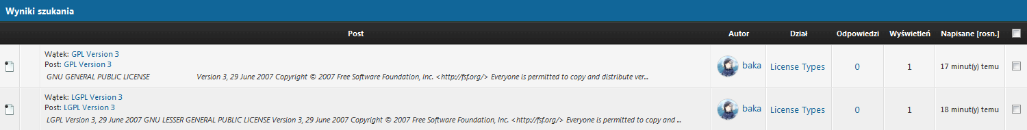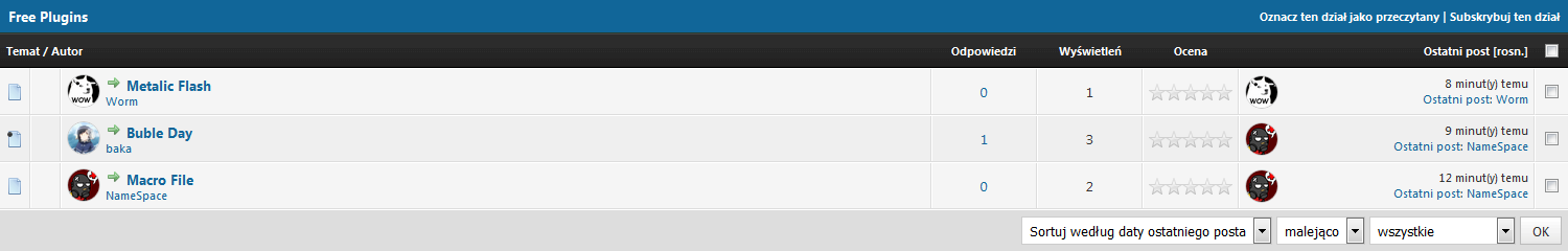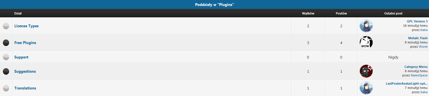 Plugin modifies forum appearance by adding avatars of thread's authors or last posting person. Avatars are being placed in many different pages such as search results, private messages, forum announcements or even in the table containing users browsing specific thread.It works without any problem among plugins like Style Usernames (by Łukasz Tkacz) or Google SEO (by Frostschutz).