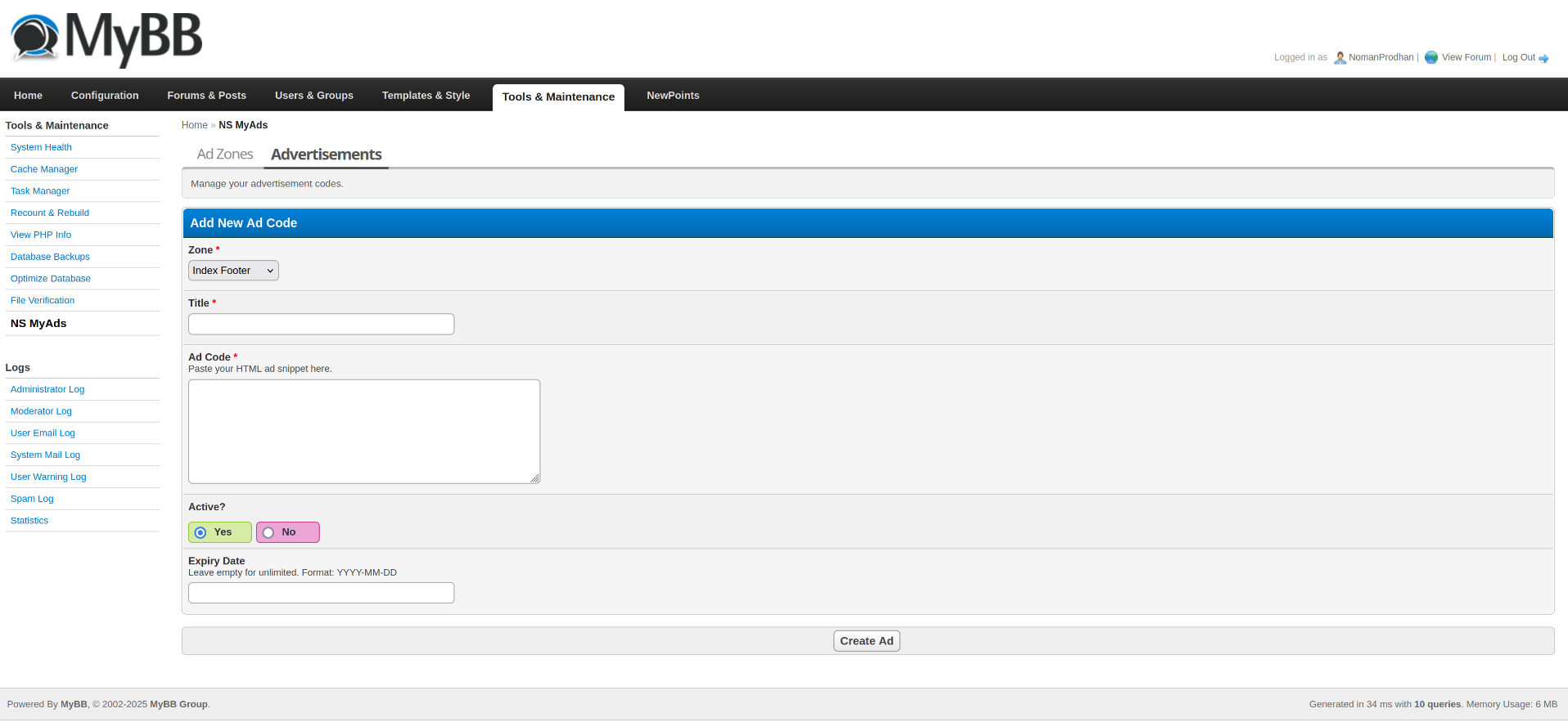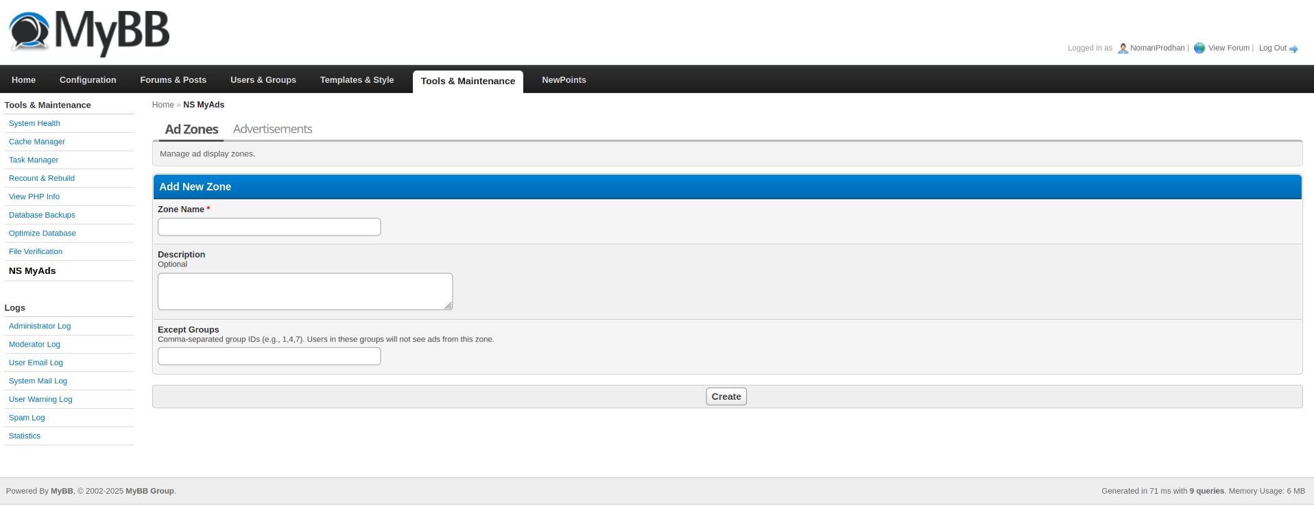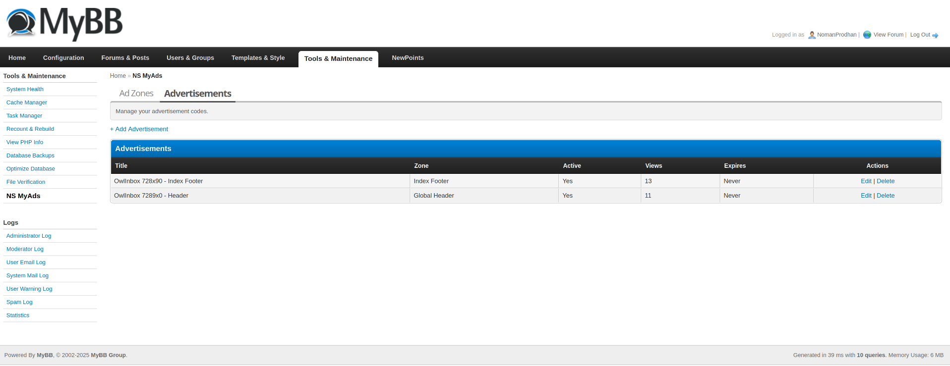 NS MyAds is a modern, lightweight advertisement management plugin for MyBB. It allows forum administrators to easily manage ad zones, inject ad codes, and track impressions — all within a clean and intuitive admin panel.Autor: NomanProdhan