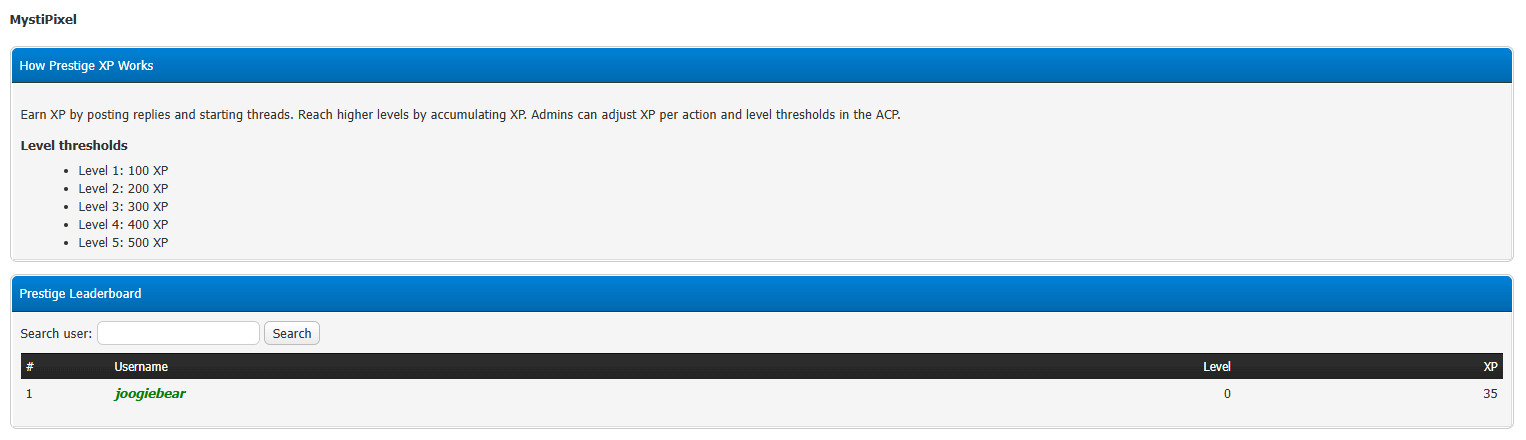 Prestige XP is a MyBB plugin that rewards forum users with experience points (XP) for posts and threads, tracks levels, displays them on postbit, and includes admin tools for managing XP and statistics.