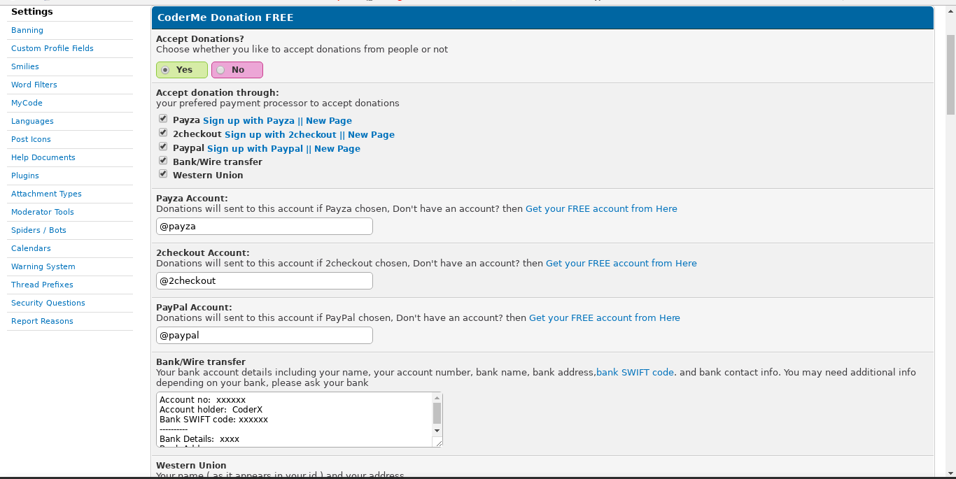 Accept Online/Offline Donations through Payza, 2checkout, PayPal, Western Union and Bank/Wire transfer.