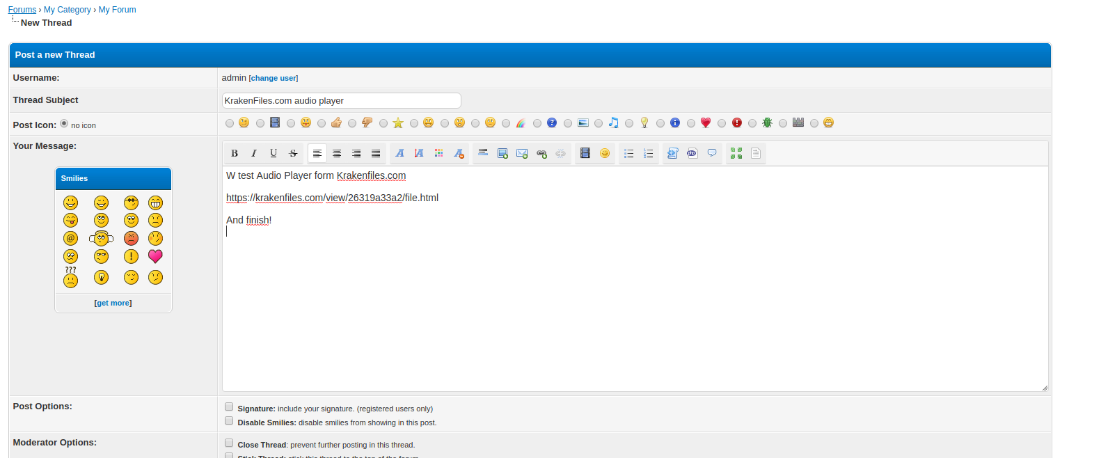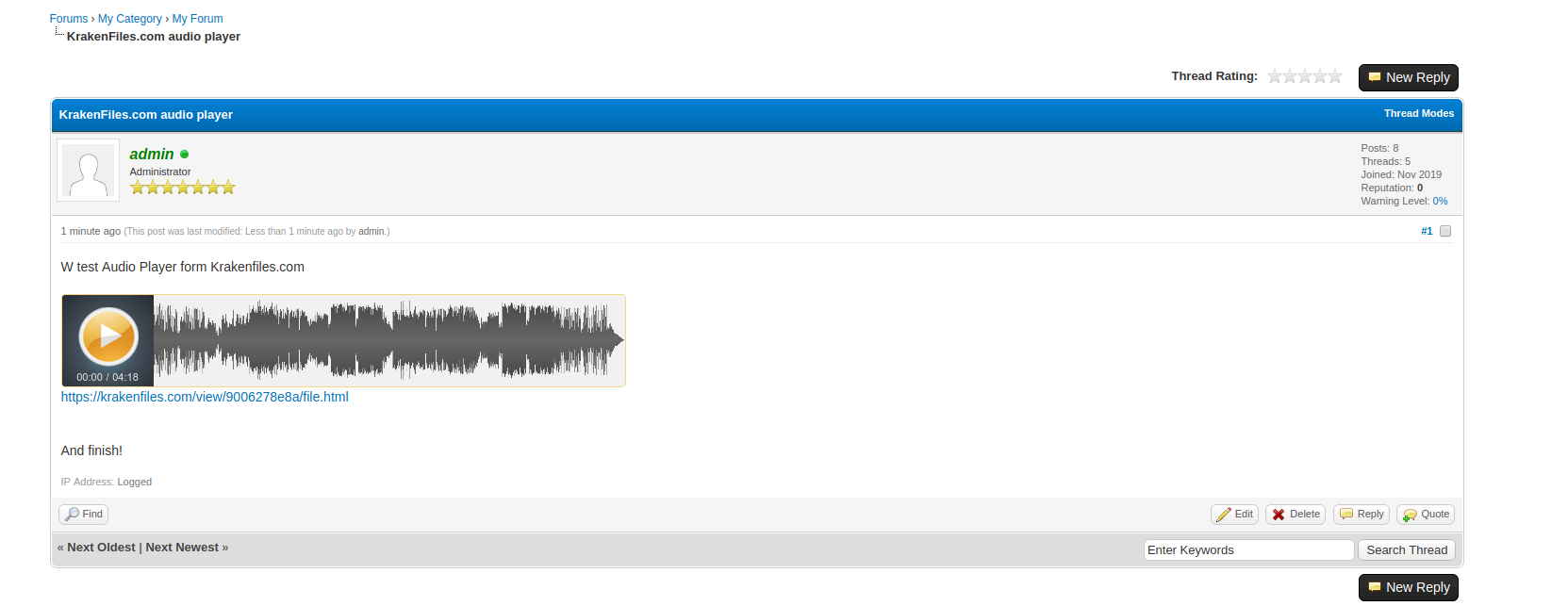 We present you first version of plugin for MyBB board. Plugin automatically converts all link to krakenfiles.com to our audio player. Plugin is very simple to use:
