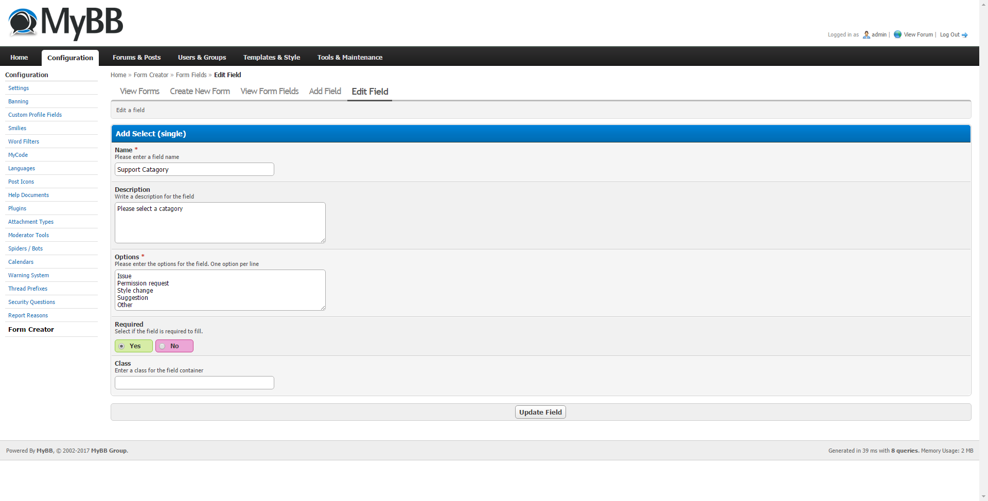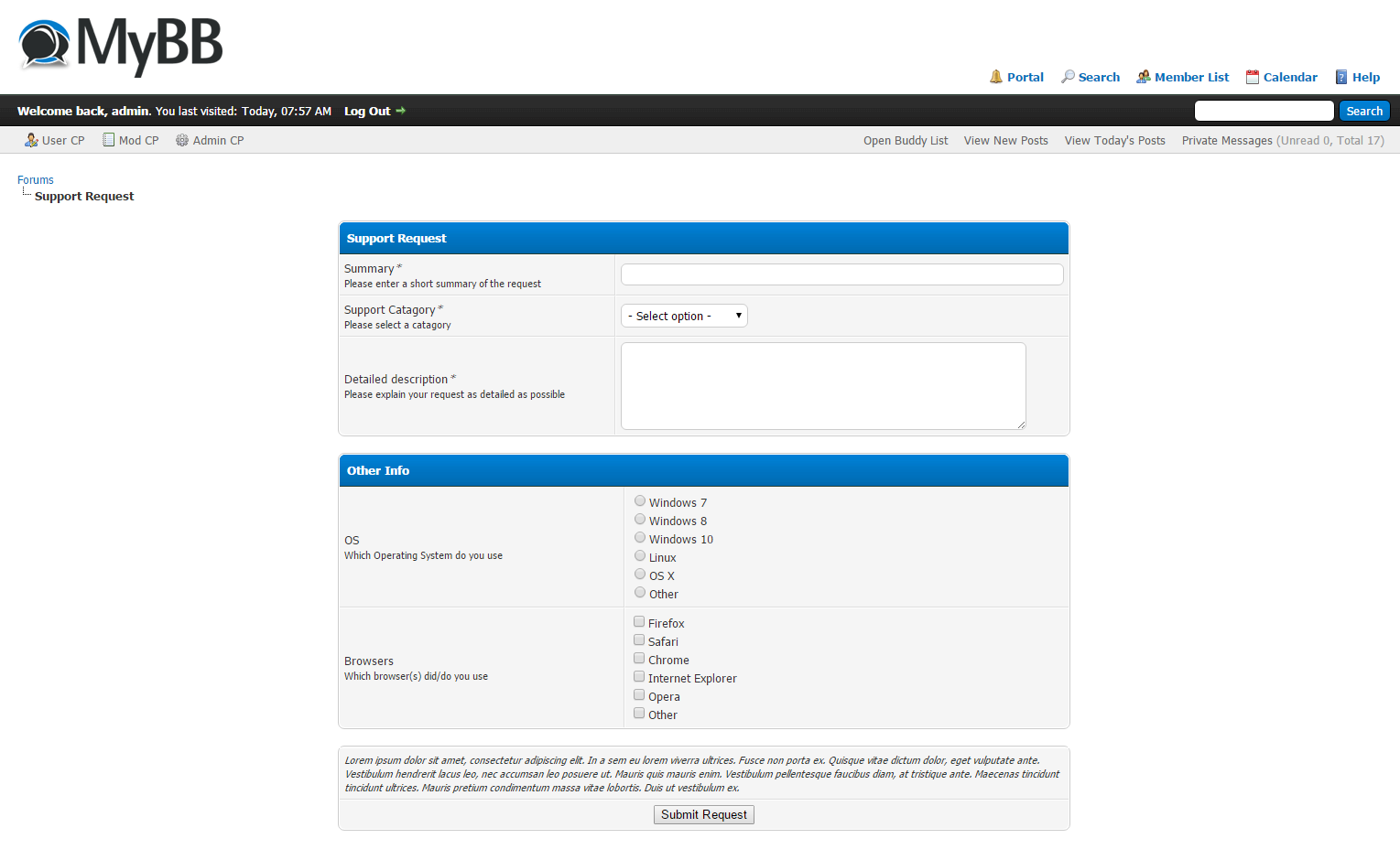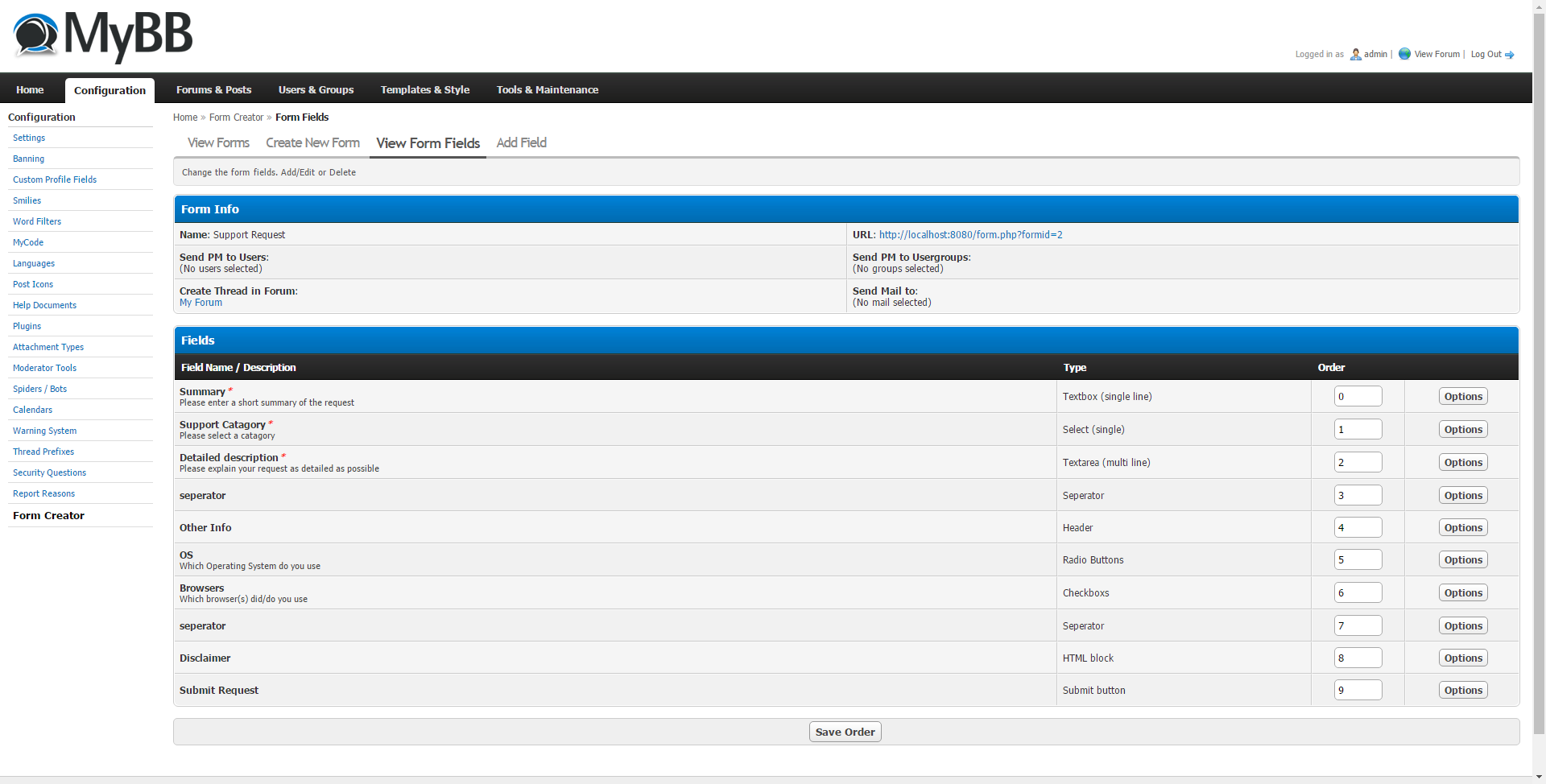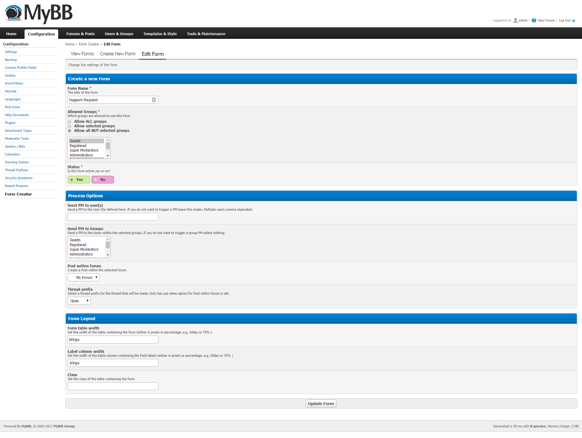 This plugin for MyBB lets forum administrators create fillable forms that can be send through PM or create a new thread in a forum.