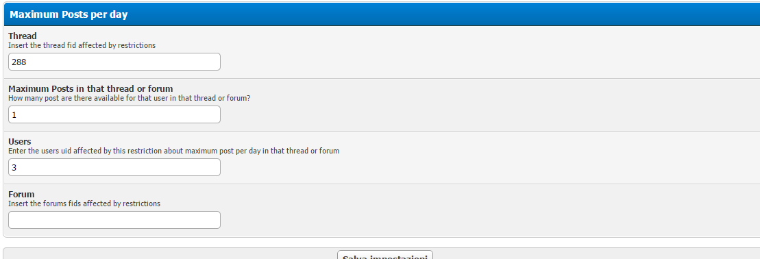 You can insert the number of the maximum posts per day available for specify users in specify threads or forums;