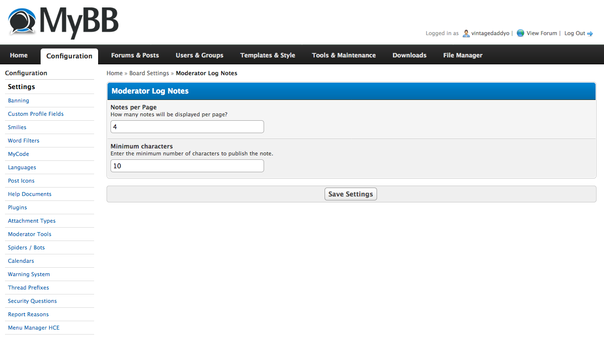 NOTE: * in MyBB 1.8.15 there is a minor bug that causes the default moderation log to load as a blank white page due to a missing semi-colon ~/admin/modules/tools/modlog.php --> Line 284