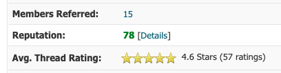- Shows an average rating (and the total count of rated threads) in user profiles.