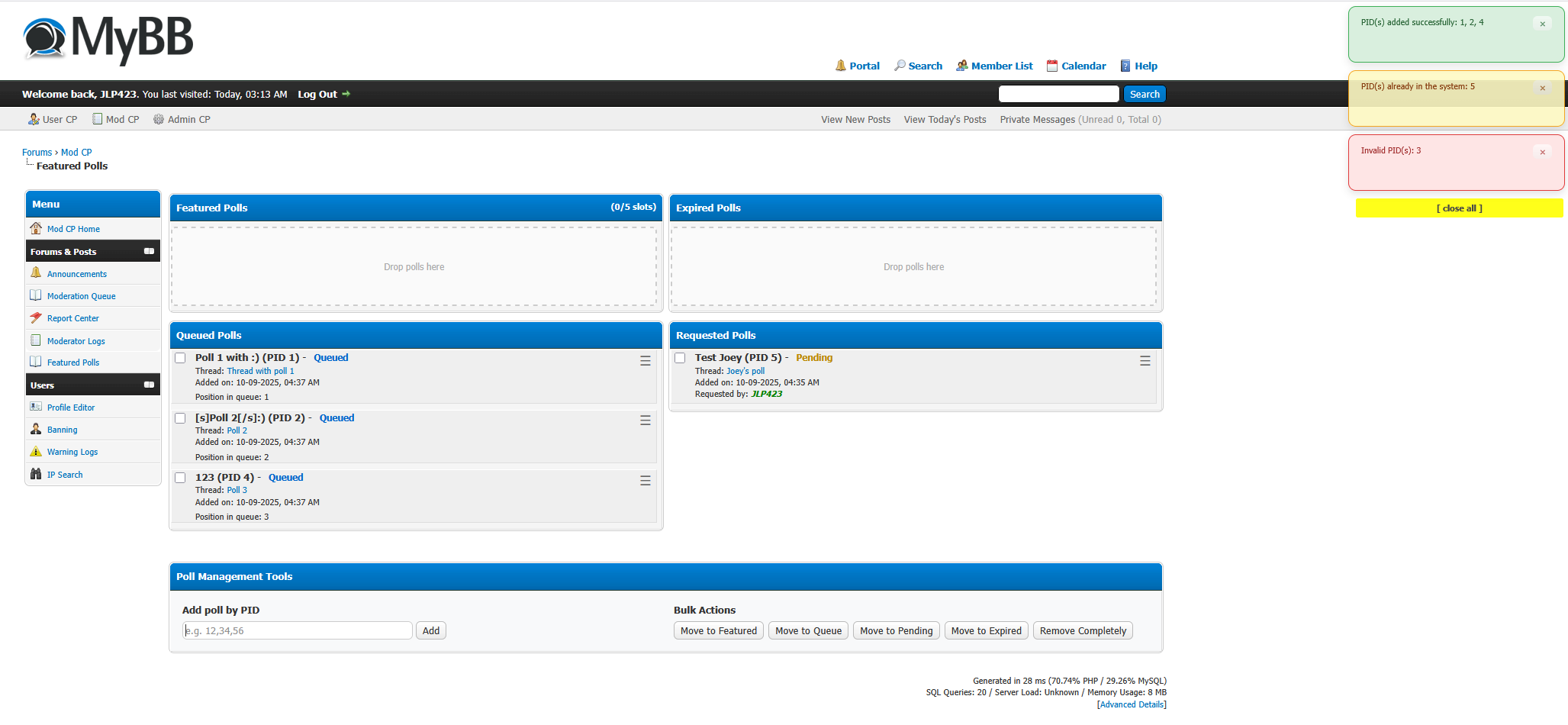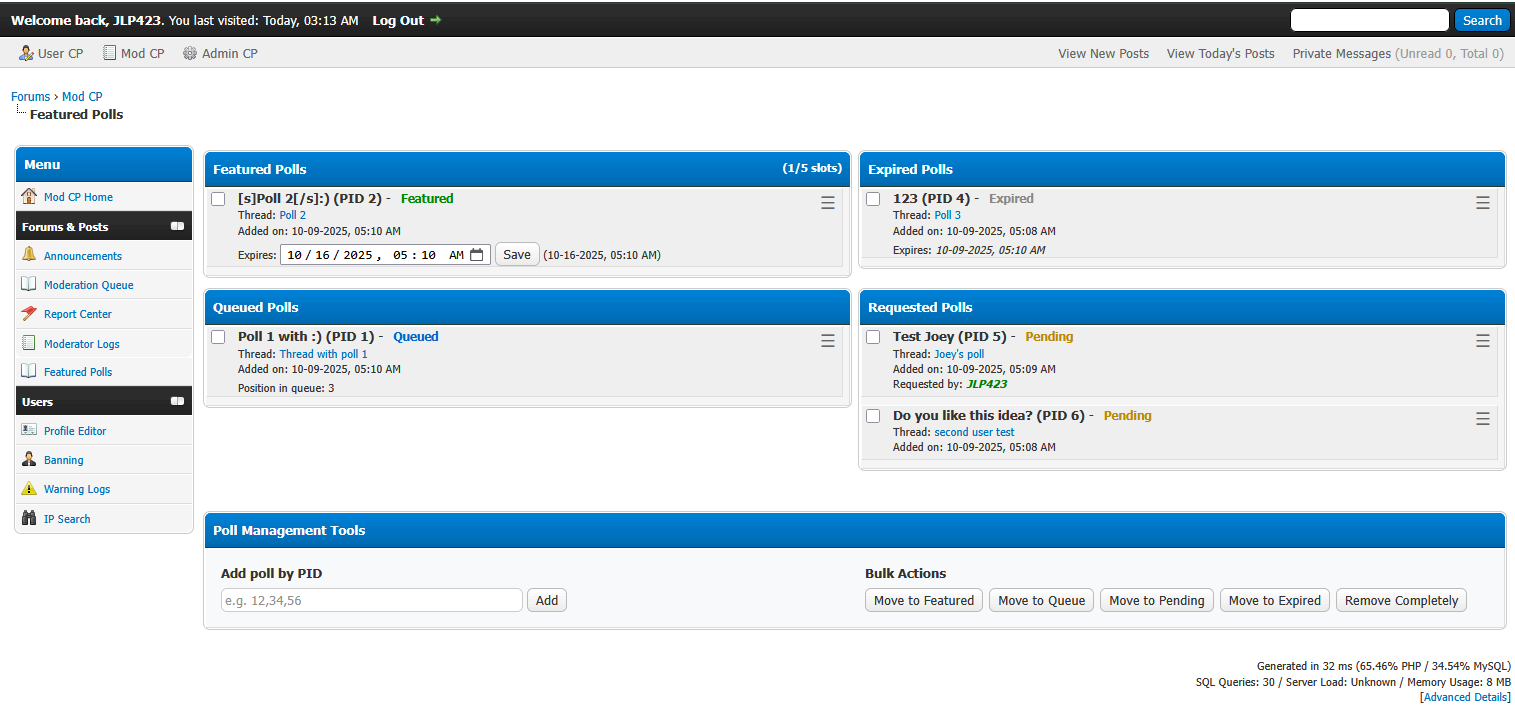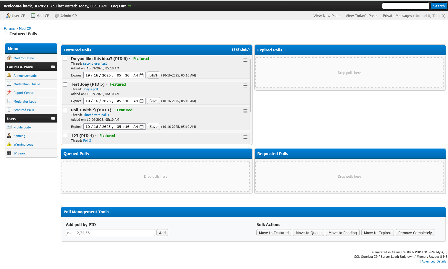 - In ModCP, drag polls to reorder between Featured / Queue / Expired / Pending