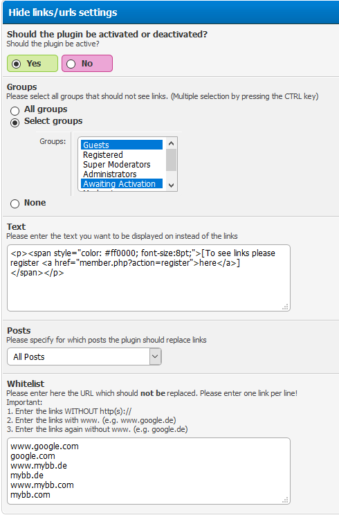 Hide links in posts from selected user groups and customize the text!